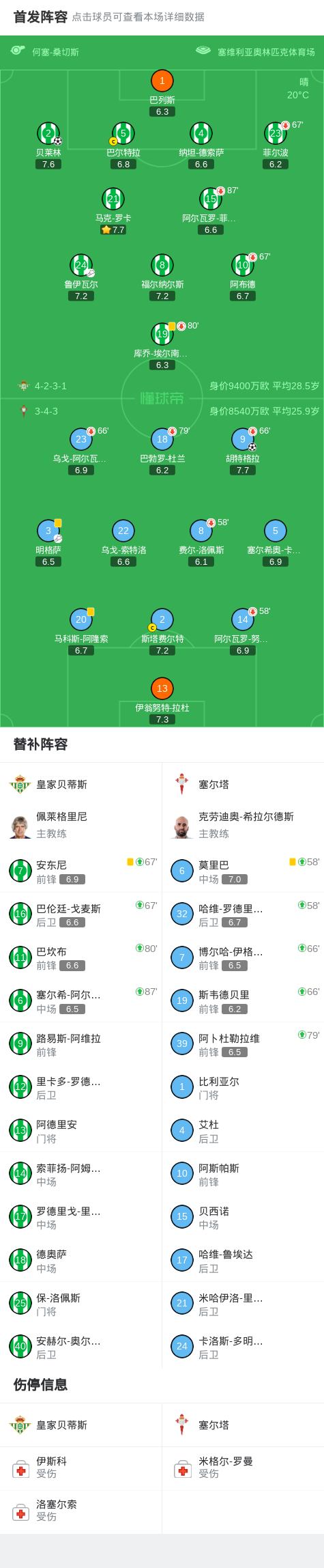 北京时间3月16日西班牙足球甲级联赛第28轮,皇家贝蒂斯主场对阵塞尔塔。上半场胡特格拉闪击破门,下半场贝莱林破门扳平比分。最终比分皇家贝蒂斯 1-1 塞尔塔。关键事件第4分钟,胡特格拉远射,巴列斯黄油手皮球进网,贝蒂斯0-1塞尔塔第49分钟,贝莱林小角度挑射破门,帮助贝蒂斯扳平,贝蒂斯1-...